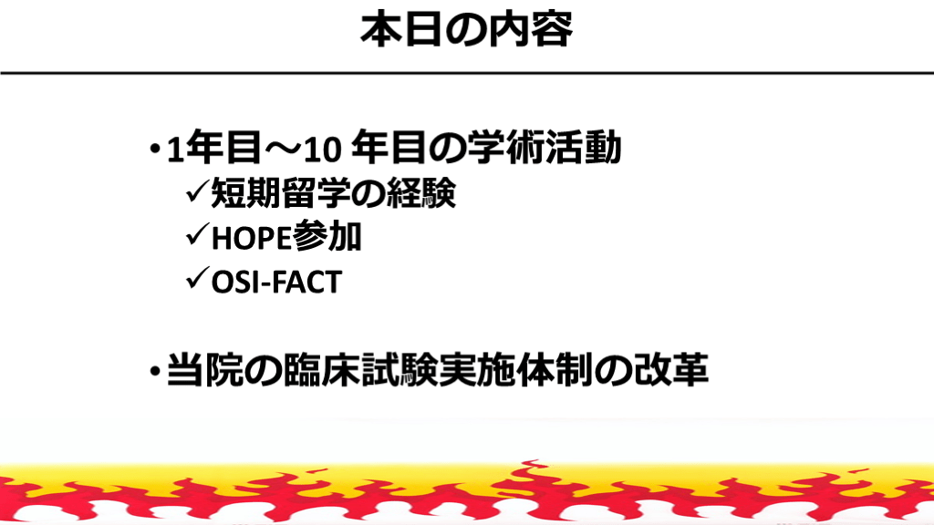 自身の経験を通した実臨床と学術活動の相互作用についてのスライドになります。