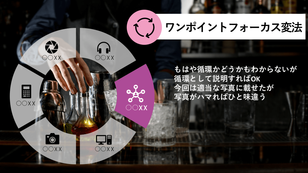 #10. ワンポイントフォーカス変法 ○○☓☓ ○○☓☓ もはや循環かどうかもわからないが 循環として説明すればOK 今回は適当な写真に載せたが 写真がハマればひと味違う ○○☓☓ ○○☓☓ ○○☓☓ ○○☓☓