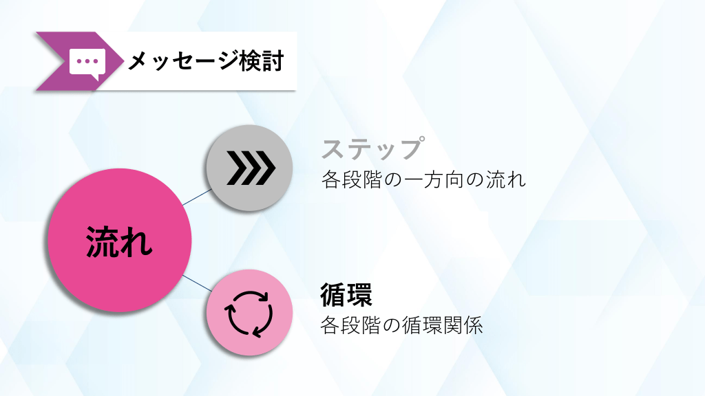 #3. メッセージ検討 ステップ 各段階の一方向の流れ 流れ 循環 各段階の循環関係