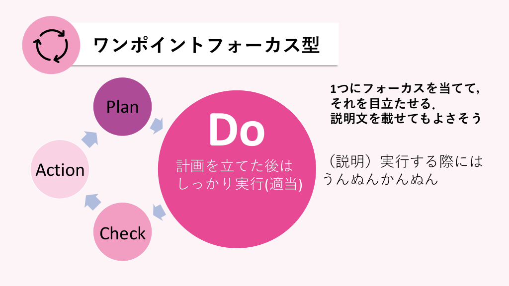 #8. ワンポイントフォーカス型 Plan Do 計画を立てた後は しっかり実行(適当) Action Check 1つにフォーカスを当てて, それを目立たせる. 説明文を載せてもよさそう (説明)実行する際には うんぬんかんぬん