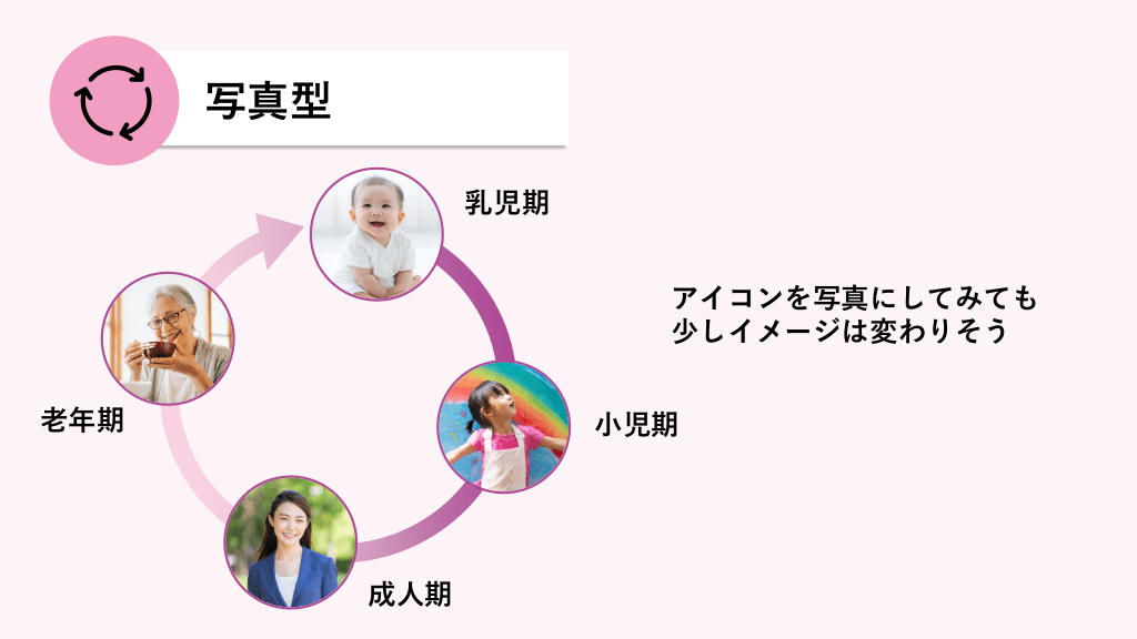 #9. 写真型 乳児期 アイコンを写真にしてみても 少しイメージは変わりそう 老年期 小児期 成人期