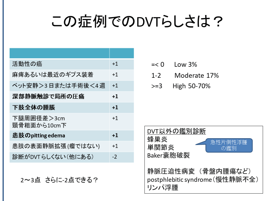 右下腿全体に圧痕性浮腫+右下腿後面に広く発赤と圧痛、 左右下腿径は大きな差がない