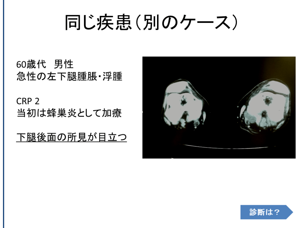 1週間前の歩行中に急な右下腿浮腫と疼痛出現