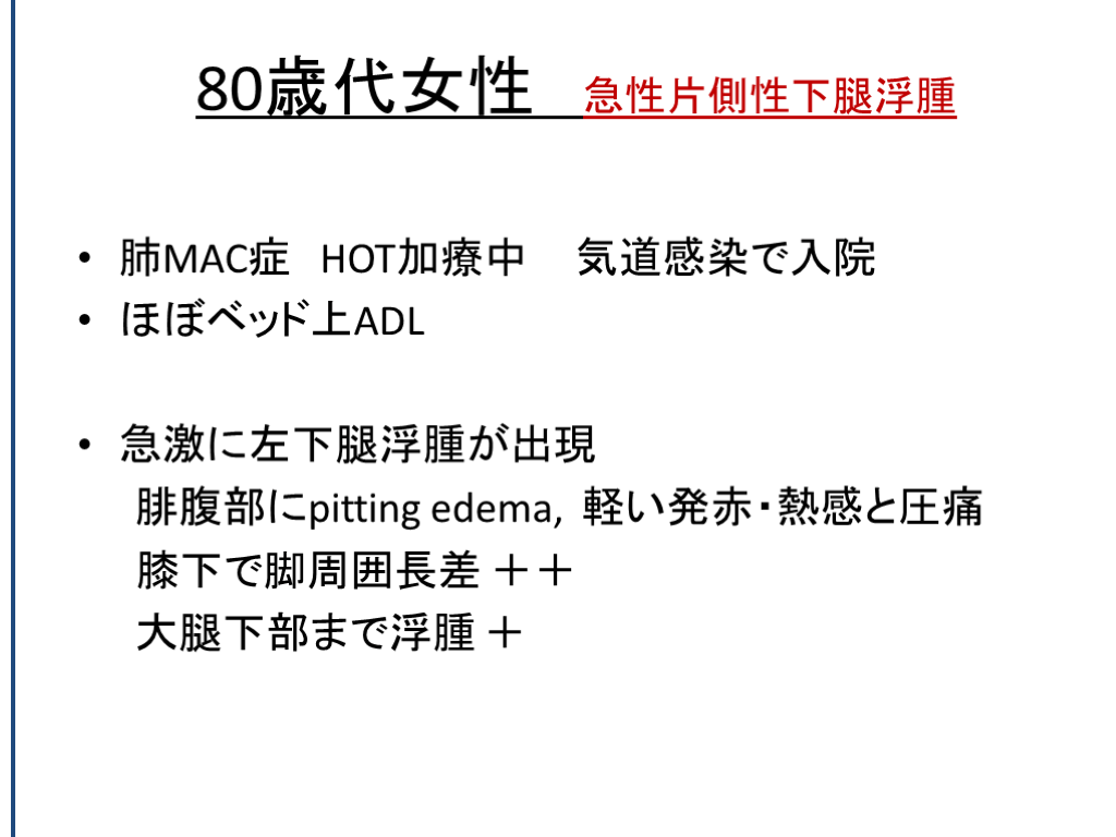 #23. 80歳代女性 急性片側性下腿浮腫 肺MAC症 HOT加療中 気道感染で入院