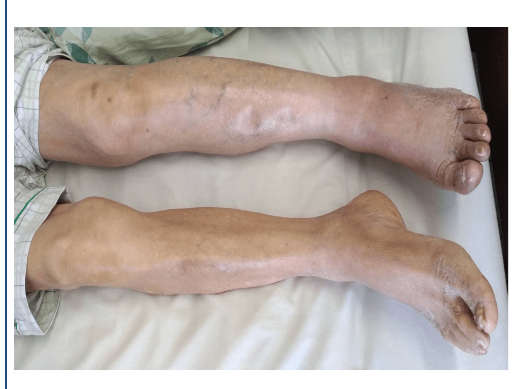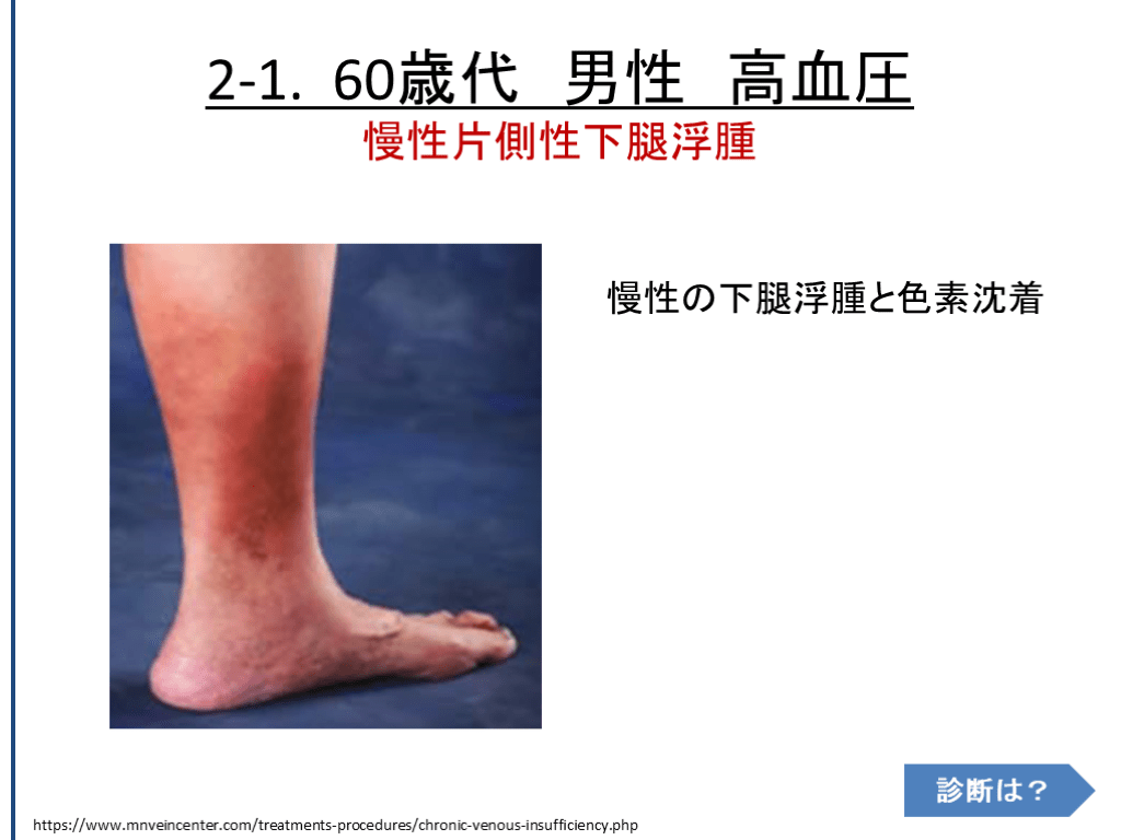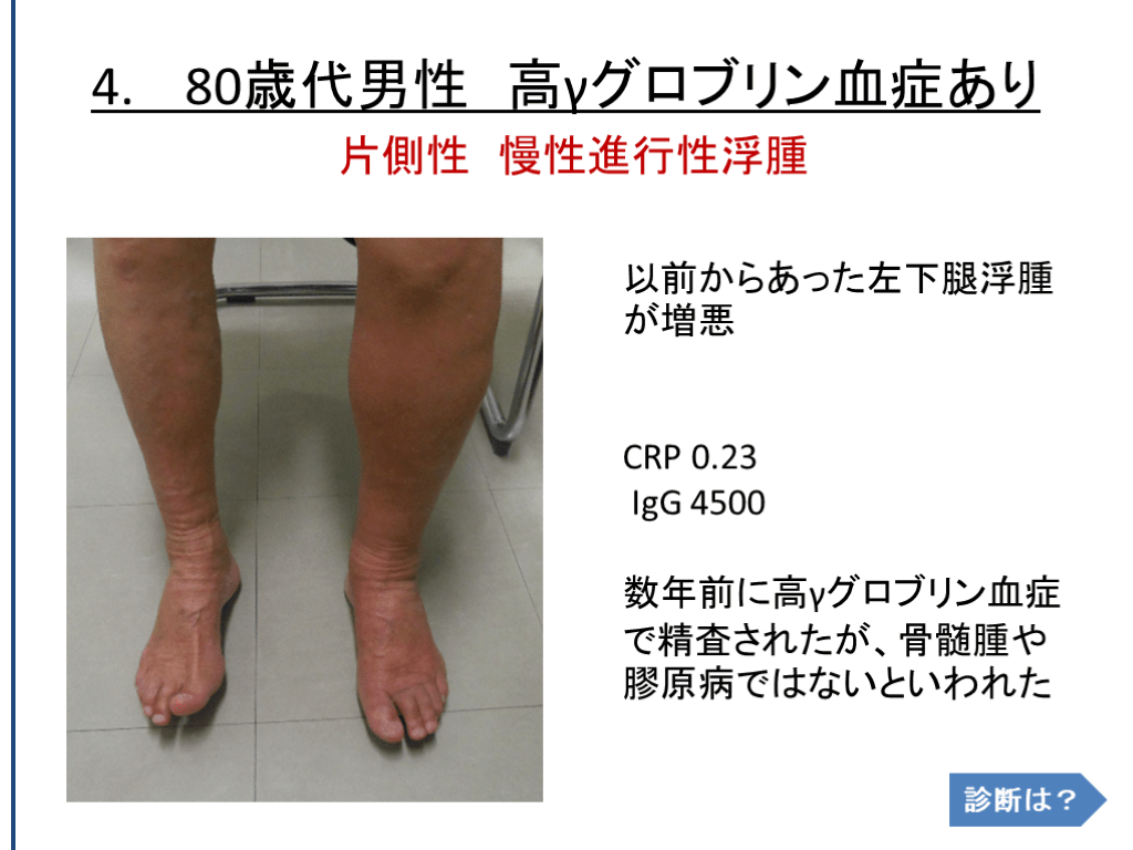 #33. 4. 80歳代男性 高γグロブリン血症あり 片側性 慢性進行性浮腫 以前からあった左下腿浮腫が増悪