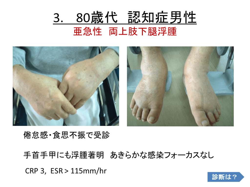 手首手甲にも浮腫著明 あきらかな感染フォーカスなし CRP 3, ESR > 115mm/hr 診断は?