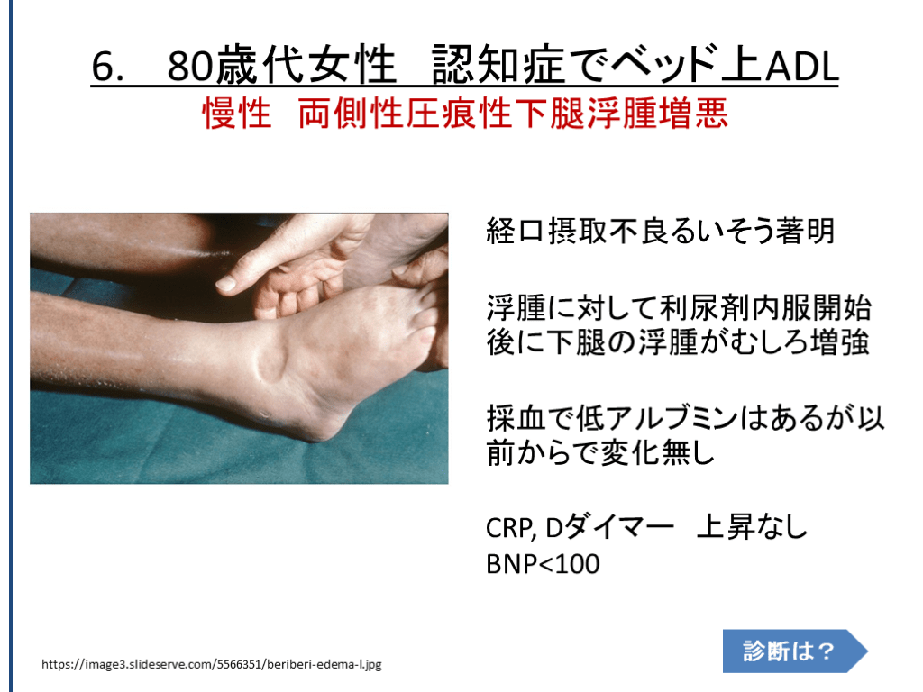 #31. 3. 80歳代 認知症男性亜急性 両上肢下腿浮腫 倦怠感・食思不振で受診
