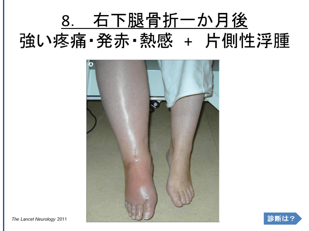 #42. 8. 右下腿骨折一か月後強い疼痛・発赤・熱感 + 片側性浮腫 診断は? The Lancet Neurology 2011