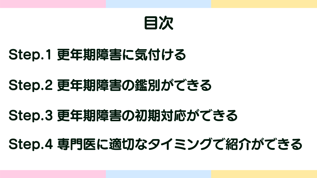 更年期症状による経済的損失1.9兆円と言われており、4割近い女性が更年期症状を何かしら有しているにも関わらず、産婦人科を受診するのは1割にも満たされてない現状です。そのため、普段のかかりつけ医であるプライマリケア医が更年期をみつけ、プライマリケアを行い、適切なタイミングで専門医につなげることが大事です。本スライドの流れは以下の通りです。