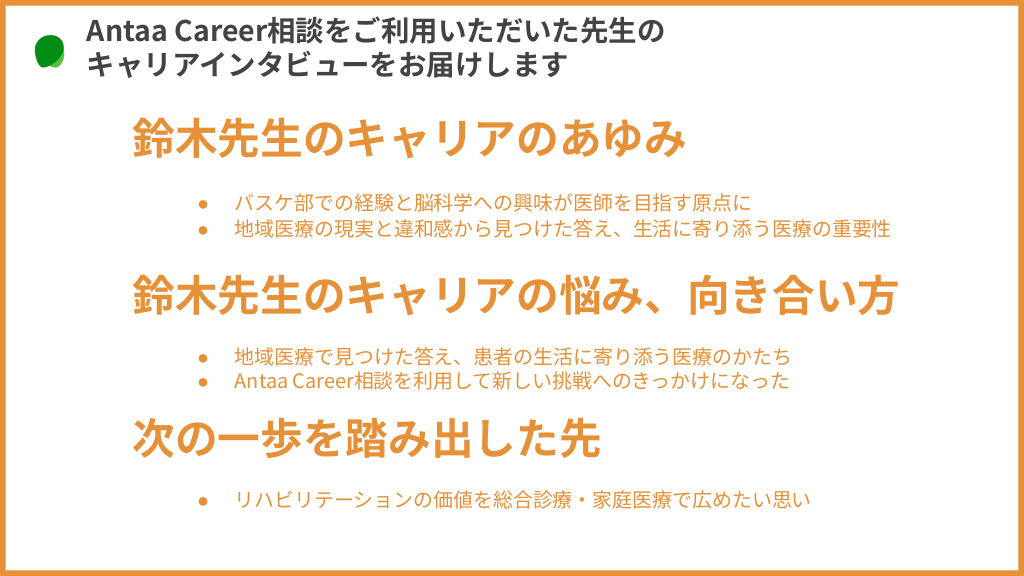 医師の新しいキャリアや働き方にフォーカスしたキャリアインタビューを掲載しているWEBメディア D35(https://career.antaa.jp/)の記事をスライドにしました。