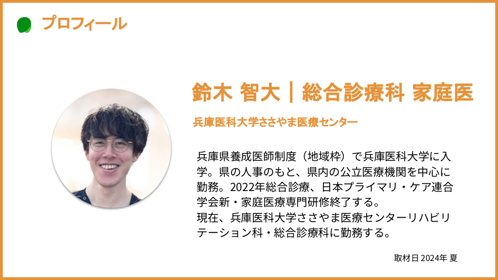 本スライドでは、兵庫県で総合診療科として勤務する鈴木智大先生(兵庫医科大学ささやま医療センターリハビリテーション科・総合診療科)の義務年限明けに向けたキャリア選択のお話、キャリア相談利用のきっかけなどをキャリアのあゆみと共にお話を伺いました。