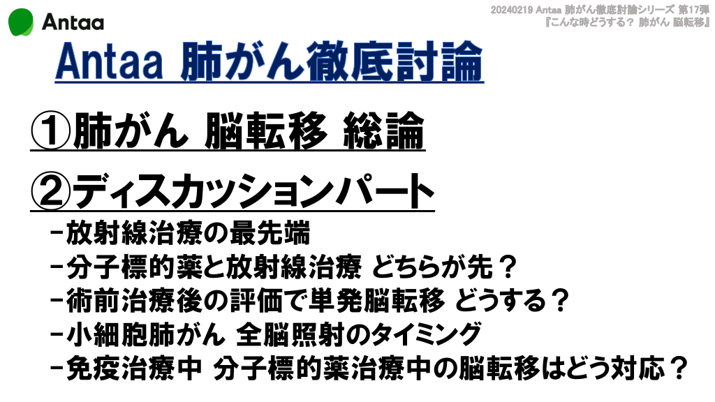ゲストに脳外科の先生をお呼びして、手術と放射線治療との使い分けから最近のトレンドまで、普段なかなか聞けない「外科医から見た脳転移」についても語って頂いたウェビナーで使用したスライドになります。