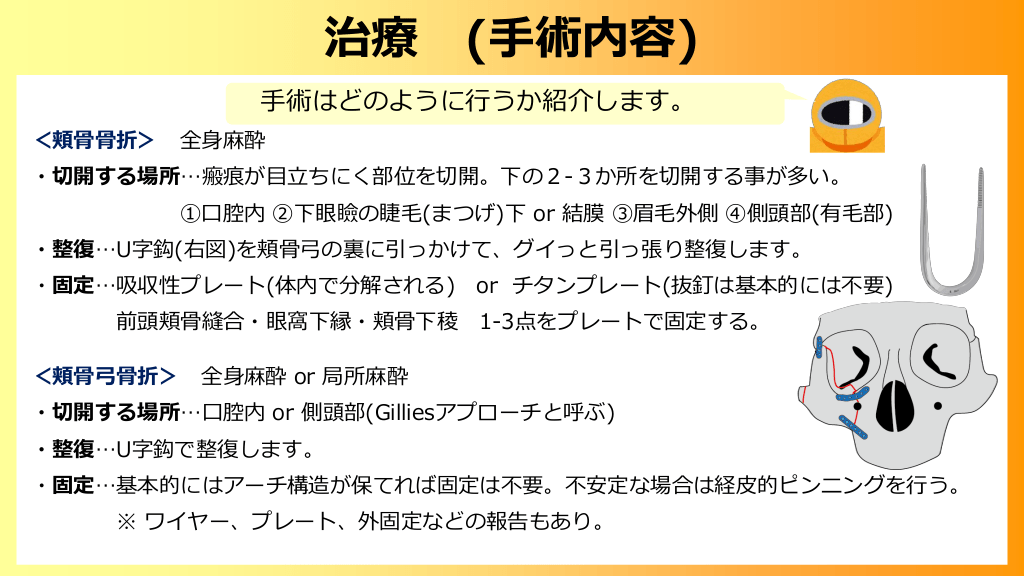 #10. 治療 (手術内容) 手術はどのように行うか紹介します。 <頬骨骨折> 全身麻酔 ・切開する場所…瘢痕が目立ちにく部位を切開。下の2-3か所を切開する事が多い。 ①口腔内 ②下眼瞼の睫毛(まつげ)下 or 結膜 ③眉毛外側 ④側頭部(有毛部) ・整復…U字鈎(右図)を頬骨弓の裏に引っかけて、グイっと引っ張り整復します。 ・固定…吸収性プレート(体内で分解される) or チタンプレート(抜釘は基本的には不要) 前頭頬骨縫合・眼窩下縁・頬骨下稜 1-3点をプレートで固定する。 <頬骨弓骨折> 全身麻酔 or 局所麻酔 ・切開する場所…口腔内 or 側頭部(Gilliesアプローチと呼ぶ) ・整復…U字鈎で整復します。 ・固定…基本的にはアーチ構造が保てれば固定は不要。不安定な場合は経皮的ピンニングを行う。 ※ ワイヤー、プレート、外固定などの報告もあり。