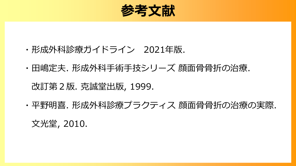 #12. 参考文献 ・形成外科診療ガイドライン 2021年版. ・田嶋定夫. 形成外科手術手技シリーズ 顔面骨骨折の治療. 改訂第2版. 克誠堂出版, 1999. ・平野明喜. 形成外科診療プラクティス 顔面骨骨折の治療の実際. 文光堂, 2010.