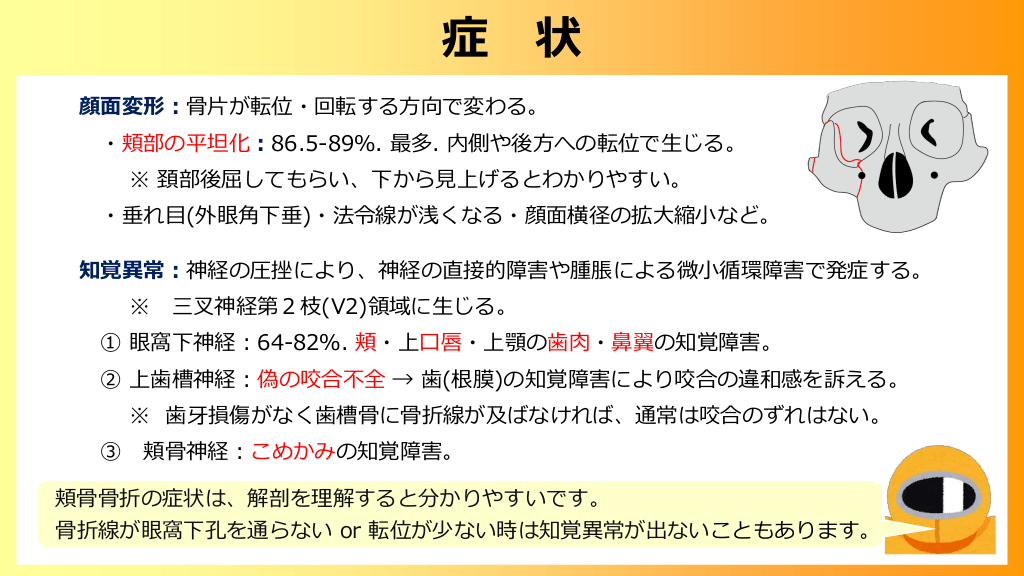 #4. 症 状 顔面変形:骨片が転位・回転する方向で変わる。 ・頬部の平坦化:86.5-89%. 最多. 内側や後方への転位で生じる。 ※ 頚部後屈してもらい、下から見上げるとわかりやすい。 ・垂れ目(外眼角下垂)・法令線が浅くなる・顔面横径の拡大縮小など。 知覚異常:神経の圧挫により、神経の直接的障害や腫脹による微小循環障害で発症する。 ※ 三叉神経第2枝(V2)領域に生じる。 ① 眼窩下神経:64-82%. 頬・上口唇・上顎の歯肉・鼻翼の知覚障害。 ② 上歯槽神経:偽の咬合不全 → 歯(根膜)の知覚障害により咬合の違和感を訴える。 ※ 歯牙損傷がなく歯槽骨に骨折線が及ばなければ、通常は咬合のずれはない。 ③ 頬骨神経:こめかみの知覚障害。 頬骨骨折の症状は、解剖を理解すると分かりやすいです。 骨折線が眼窩下孔を通らない or 転位が少ない時は知覚異常が出ないこともあります。