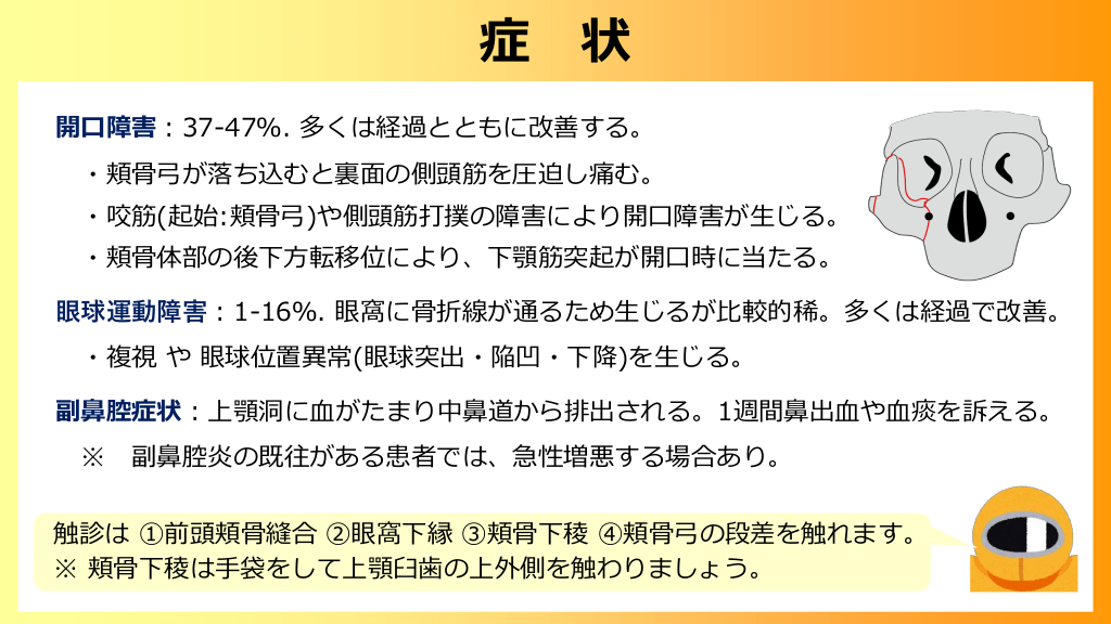 #5. 症 状 開口障害:37-47%. 多くは経過とともに改善する。 ・頬骨弓が落ち込むと裏面の側頭筋を圧迫し痛む。 ・咬筋(起始:頬骨弓)や側頭筋打撲の障害により開口障害が生じる。 ・頬骨体部の後下方転移位により、下顎筋突起が開口時に当たる。 眼球運動障害:1-16%. 眼窩に骨折線が通るため生じるが比較的稀。多くは経過で改善。 ・複視 や 眼球位置異常(眼球突出・陥凹・下降)を生じる。 副鼻腔症状:上顎洞に血がたまり中鼻道から排出される。1週間鼻出血や血痰を訴える。 ※ 副鼻腔炎の既往がある患者では、急性増悪する場合あり。 触診は ①前頭頬骨縫合 ②眼窩下縁 ③頬骨下稜 ④頬骨弓の段差を触れます。 ※ 頬骨下稜は手袋をして上顎臼歯の上外側を触わりましょう。