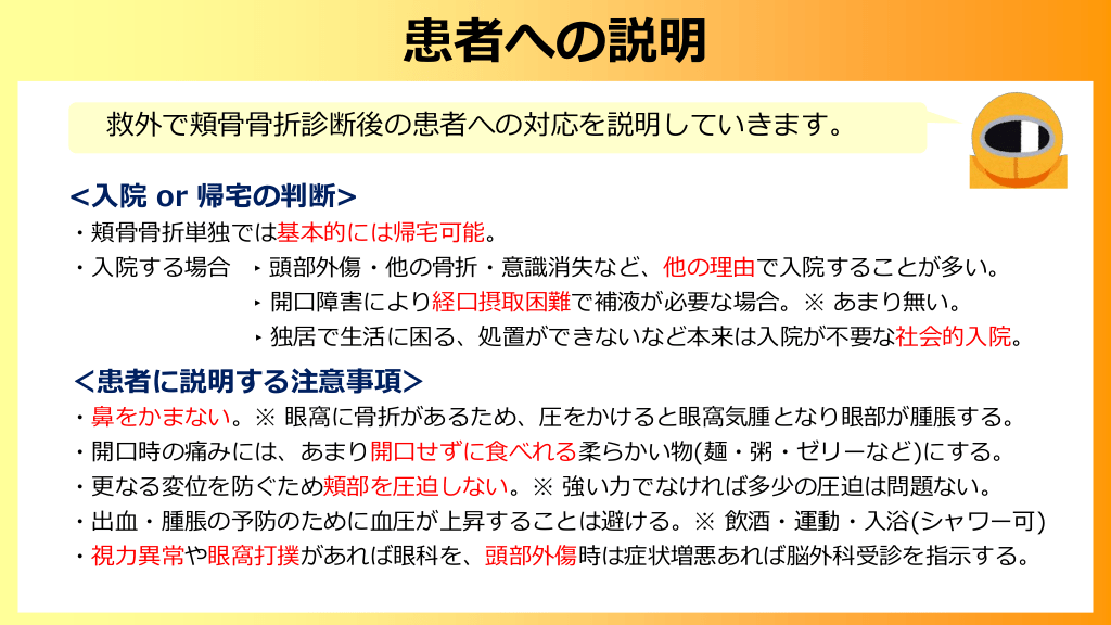 #7. 患者への説明 救外で頬骨骨折診断後の患者への対応を説明していきます。 <入院 or 帰宅の判断> ・頬骨骨折単独では基本的には帰宅可能。 ・入院する場合 ‣頭部外傷・他の骨折・意識消失など、他の理由で入院することが多い。 ‣開口障害により経口摂取困難で補液が必要な場合。※ あまり無い。 ‣独居で生活に困る、処置ができないなど本来は入院が不要な社会的入院。 <患者に説明する注意事項> ・鼻をかまない。※ 眼窩に骨折があるため、圧をかけると眼窩気腫となり眼部が腫脹する。 ・開口時の痛みには、あまり開口せずに食べれる柔らかい物(麺・粥・ゼリーなど)にする。 ・更なる変位を防ぐため頬部を圧迫しない。※ 強い力でなければ多少の圧迫は問題ない。 ・出血・腫脹の予防のために血圧が上昇することは避ける。※ 飲酒・運動・入浴(シャワー可) ・視力異常や眼窩打撲があれば眼科を、頭部外傷時は症状増悪あれば脳外科受診を指示する。