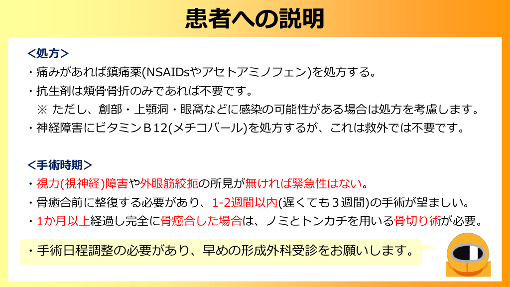 #8. 患者への説明 <処方> ・痛みがあれば鎮痛薬(NSAIDsやアセトアミノフェン)を処方する。 ・抗生剤は頬骨骨折のみであれば不要です。 ※ ただし、創部・上顎洞・眼窩などに感染の可能性がある場合は処方を考慮します。 ・神経障害にビタミンB12(メチコバール)を処方するが、これは救外では不要です。 <手術時期> ・視力(視神経)障害や外眼筋絞扼の所見が無ければ緊急性はない。 ・骨癒合前に整復する必要があり、1-2週間以内(遅くても3週間)の手術が望ましい。 ・1か月以上経過し完全に骨癒合した場合は、ノミとトンカチを用いる骨切り術が必要。 ・手術日程調整の必要があり、早めの形成外科受診をお願いします。