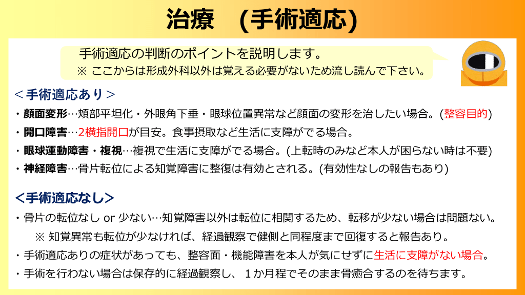 #9. 治療 (手術適応) 手術適応の判断のポイントを説明します。 ※ ここからは形成外科以外は覚える必要がないため流し読んで下さい。 <手術適応あり> ・顔面変形…頬部平坦化・外眼角下垂・眼球位置異常など顔面の変形を治したい場合。(整容目的) ・開口障害…2横指開口が目安。食事摂取など生活に支障がでる場合。 ・眼球運動障害・複視…複視で生活に支障がでる場合。(上転時のみなど本人が困らない時は不要) ・神経障害…骨片転位による知覚障害に整復は有効とされる。(有効性なしの報告もあり) <手術適応なし> ・骨片の転位なし or 少ない…知覚障害以外は転位に相関するため、転移が少ない場合は問題ない。 ※ 知覚異常も転位が少なければ、経過観察で健側と同程度まで回復すると報告あり。 ・手術適応ありの症状があっても、整容面・機能障害を本人が気にせずに生活に支障がない場合。 ・手術を行わない場合は保存的に経過観察し、1か月程でそのまま骨癒合するのを待ちます。