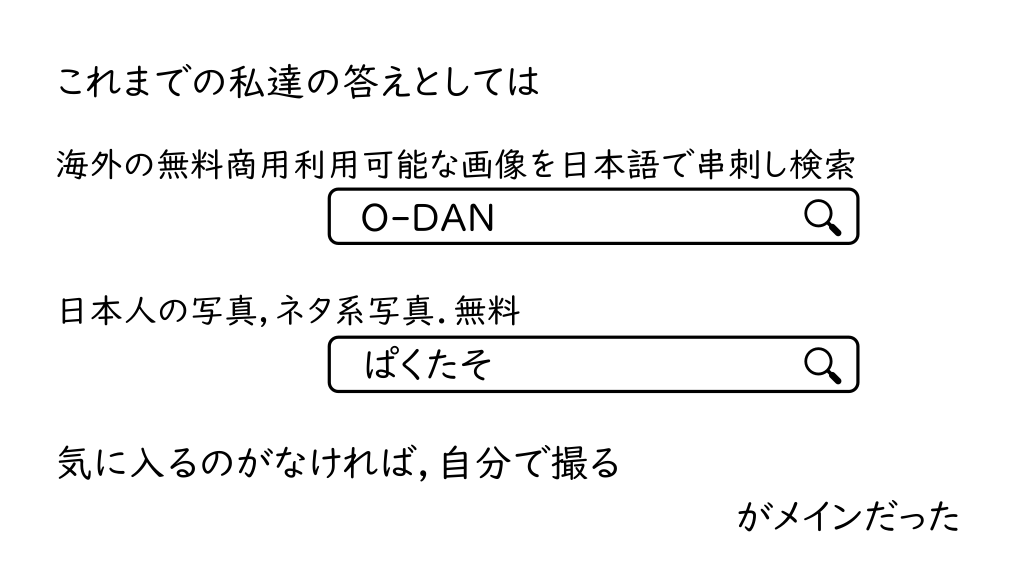 #3. これまでの私達の答えとしては 海外の無料商用利用可能な画像を日本語で串刺し検索 O-DAN 日本人の写真,ネタ系写真.無料 ぱくたそ 気に入るのがなければ,自分で撮る がメインだった