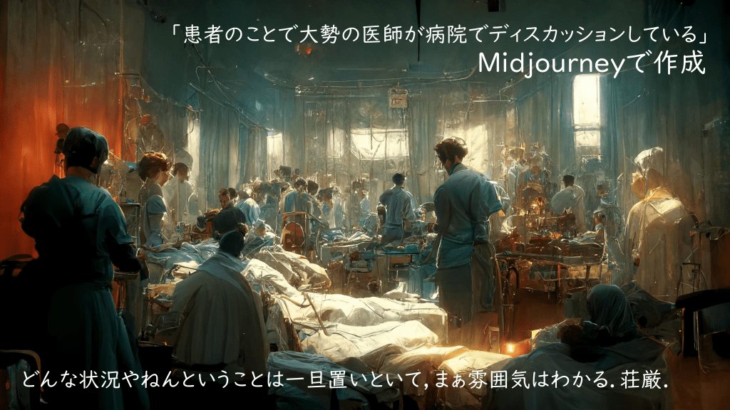 #5. 「患者のことで大勢の医師が病院でディスカッションしている」 Midjourneyで作成 どんな状況やねんということは一旦置いといて,まぁ雰囲気はわかる.荘厳.