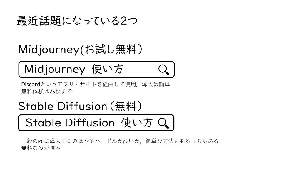 #6. 最近話題になっている2つ Midjourney(お試し無料) Midjourney 使い方 Discordというアプリ・サイトを経由して使用.導入は簡単 無料体験は25枚まで Stable Diffusion(無料) Stable Diffusion 使い方 一般のPCに導入するのはややハードルが高いが,簡単な方法もあるっちゃある 無料なのが強み