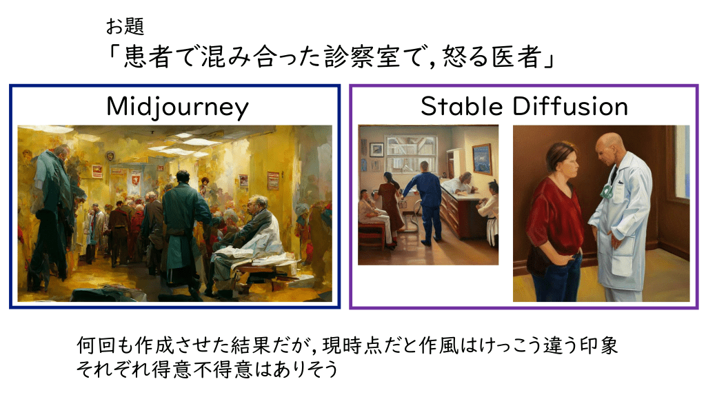#7. お題 「患者で混み合った診察室で,怒る医者」 Midjourney Stable Diffusion 何回も作成させた結果だが,現時点だと作風はけっこう違う印象 それぞれ得意不得意はありそう