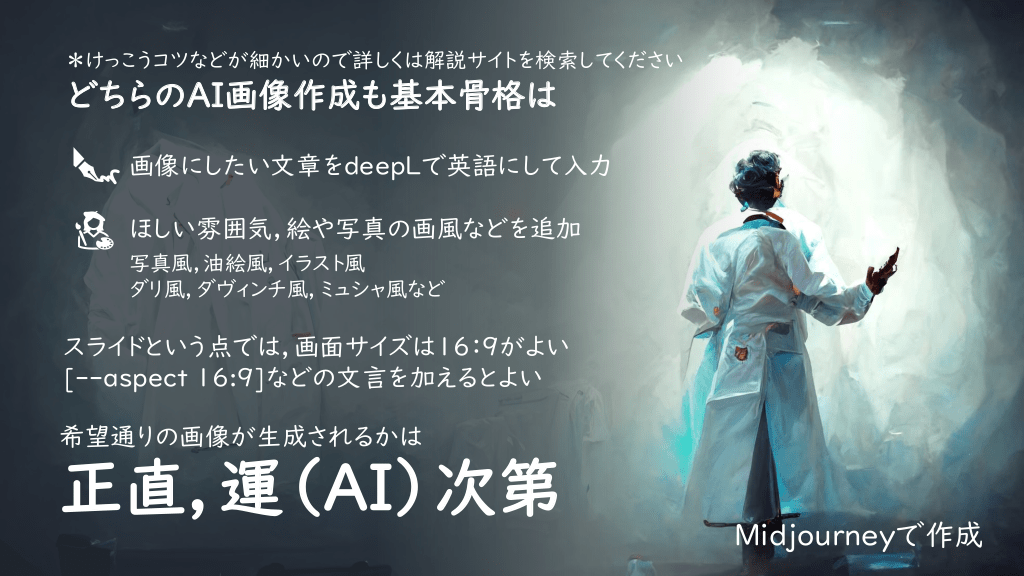 #8. *けっこうコツなどが細かいので詳しくは解説サイトを検索してください どちらのAI画像作成も基本骨格は 画像にしたい文章をdeepLで英語にして入力 ほしい雰囲気,絵や写真の画風などを追加 写真風,油絵風,イラスト風 ダリ風,ダヴィンチ風,ミュシャ風など スライドという点では,画面サイズは16:9がよい [--aspect 16:9]などの文言を加えるとよい 希望通りの画像が生成されるかは 正直,運(AI)次第 Midjourneyで作成