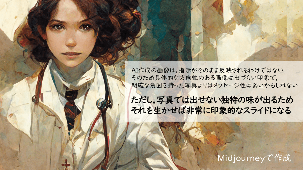 #9. AI作成の画像は,指示がそのまま反映されるわけではない そのため具体的な方向性のある画像は出づらい印象で, 明確な意図を持った写真よりはメッセージ性は弱いかもしれない ただし,写真では出せない独特の味が出るため それを生かせば非常に印象的なスライドになる Midjourneyで作成