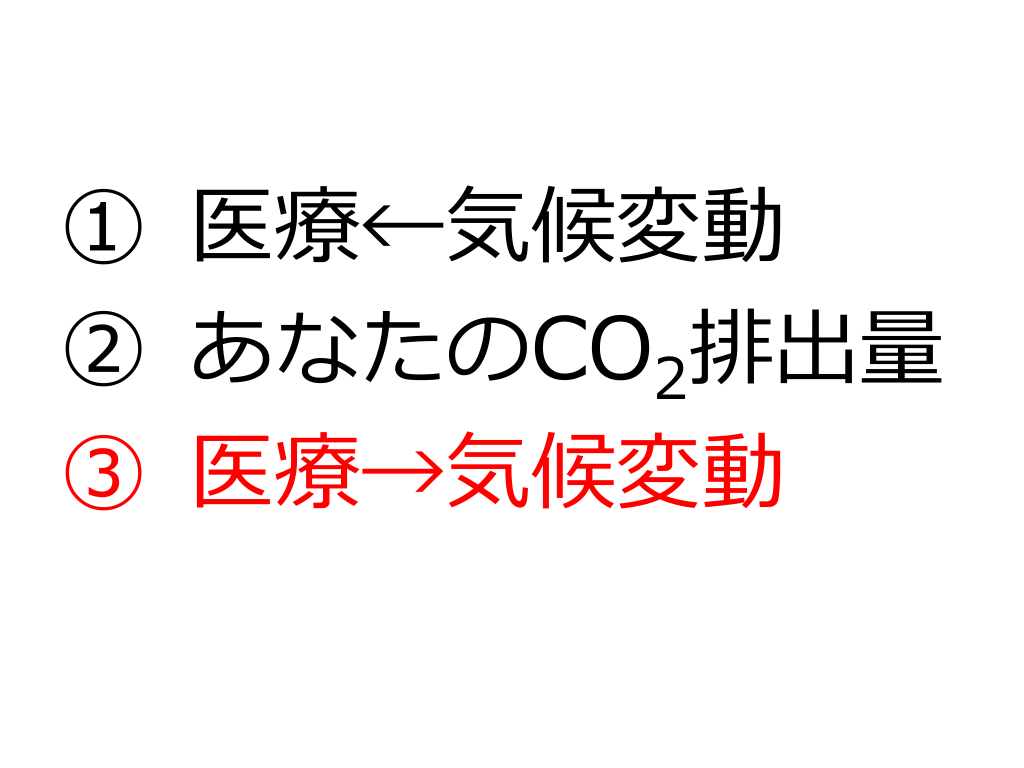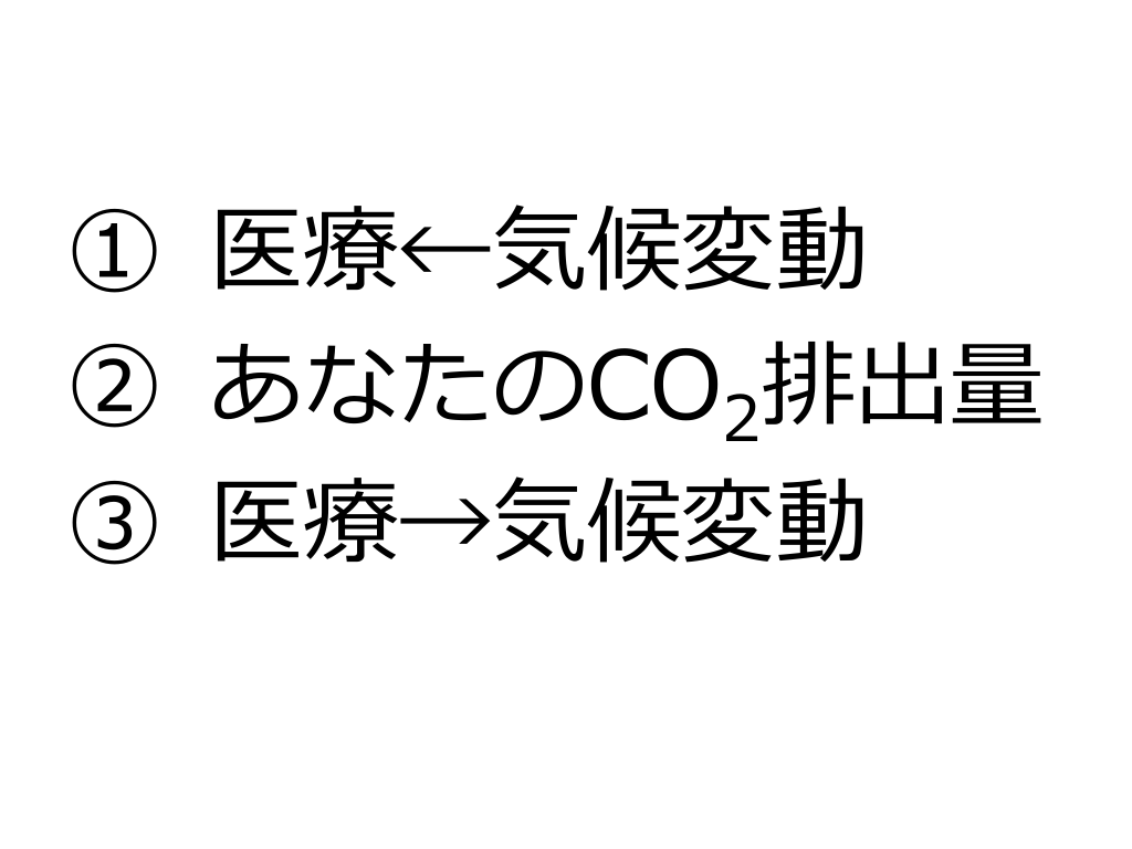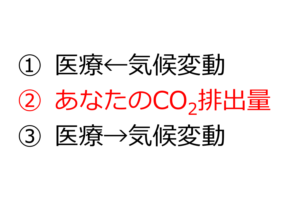 #32. ① 医療←気候変動 ② あなたのCO2排出量 ③ 医療→気候変動