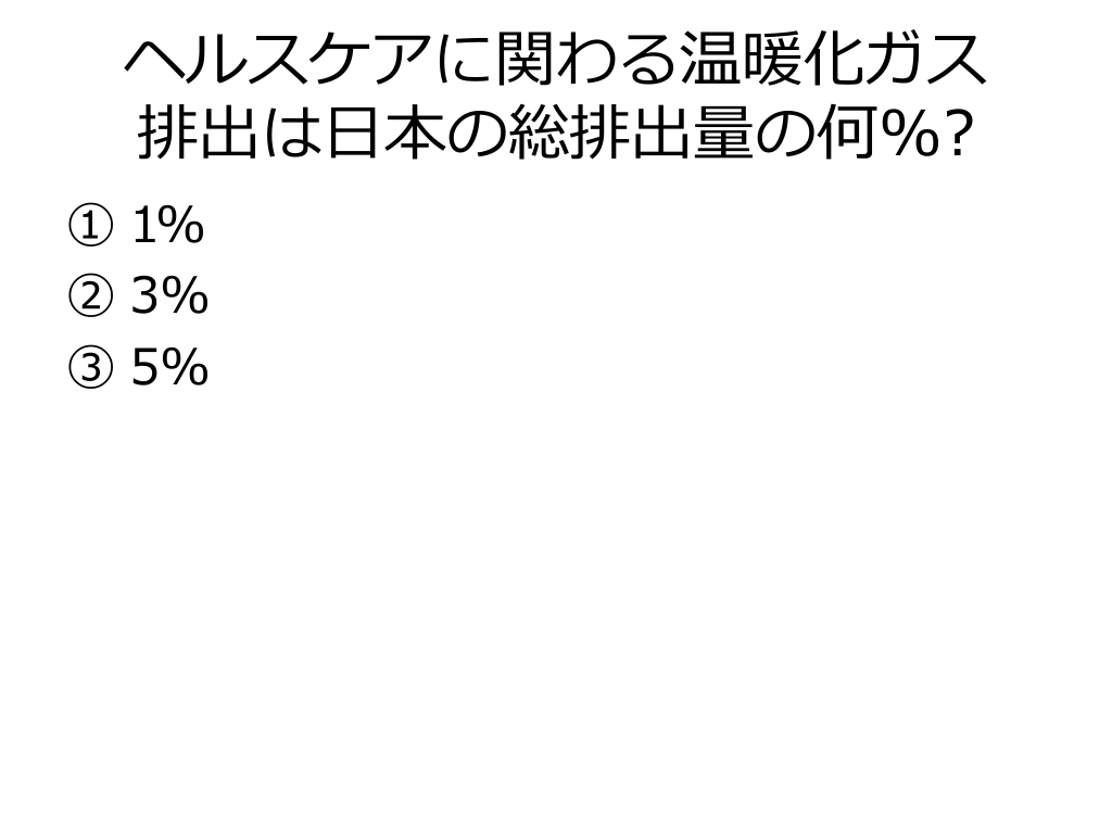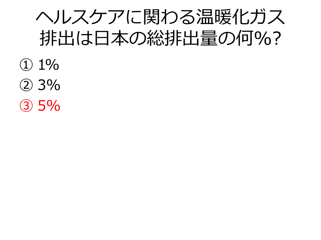 #33. ヘルスケアに関わる温暖化ガス 排出は⽇本の総排出量の何%? ① 1% ② 3% ③ 5%