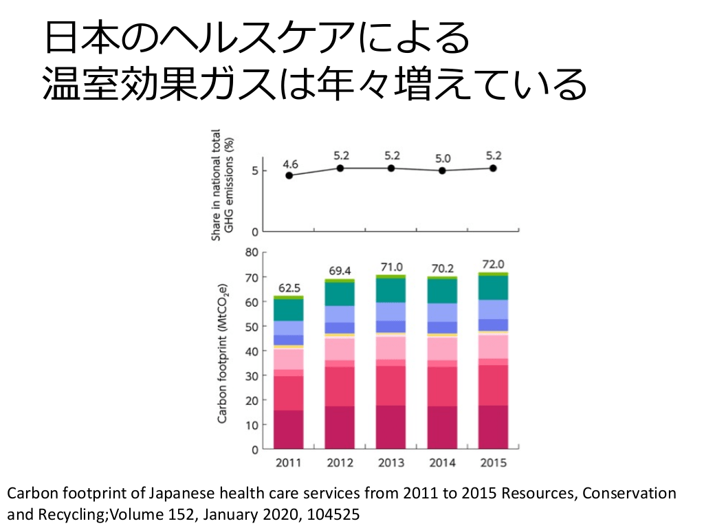 #34. ⽇本のヘルスケアによる 温室効果ガスは年々増えている Carbon footprint of Japanese health care services from 2011 to 2015 Resources, Conservation and Recycling;Volume 152, January 2020, 104525