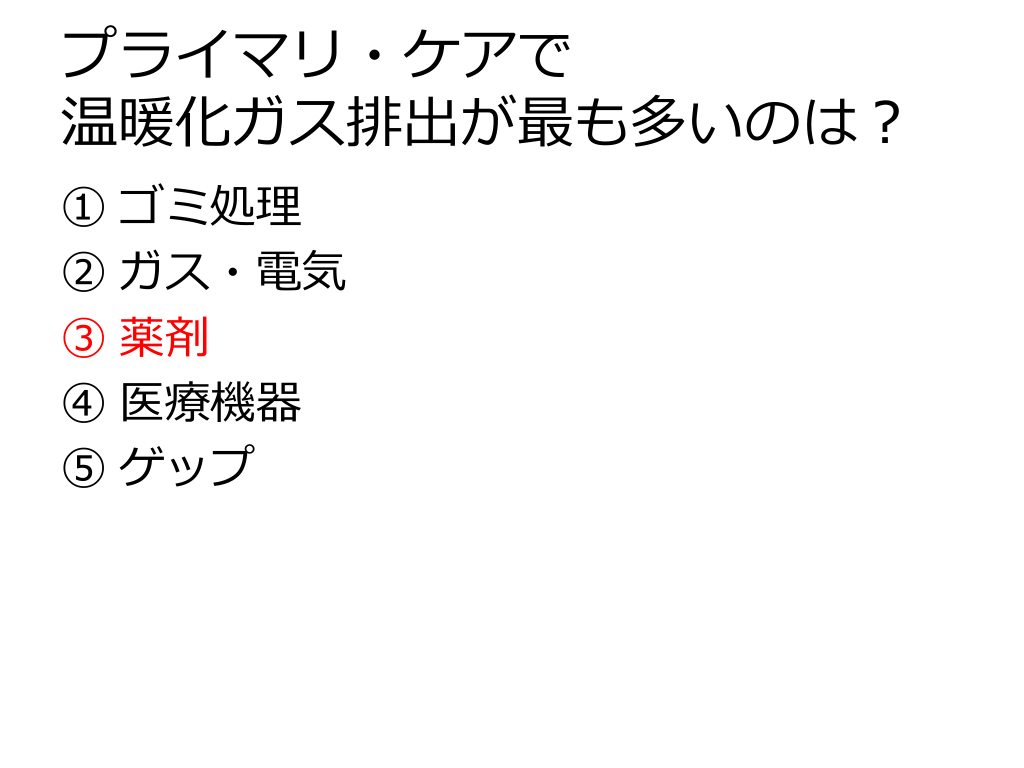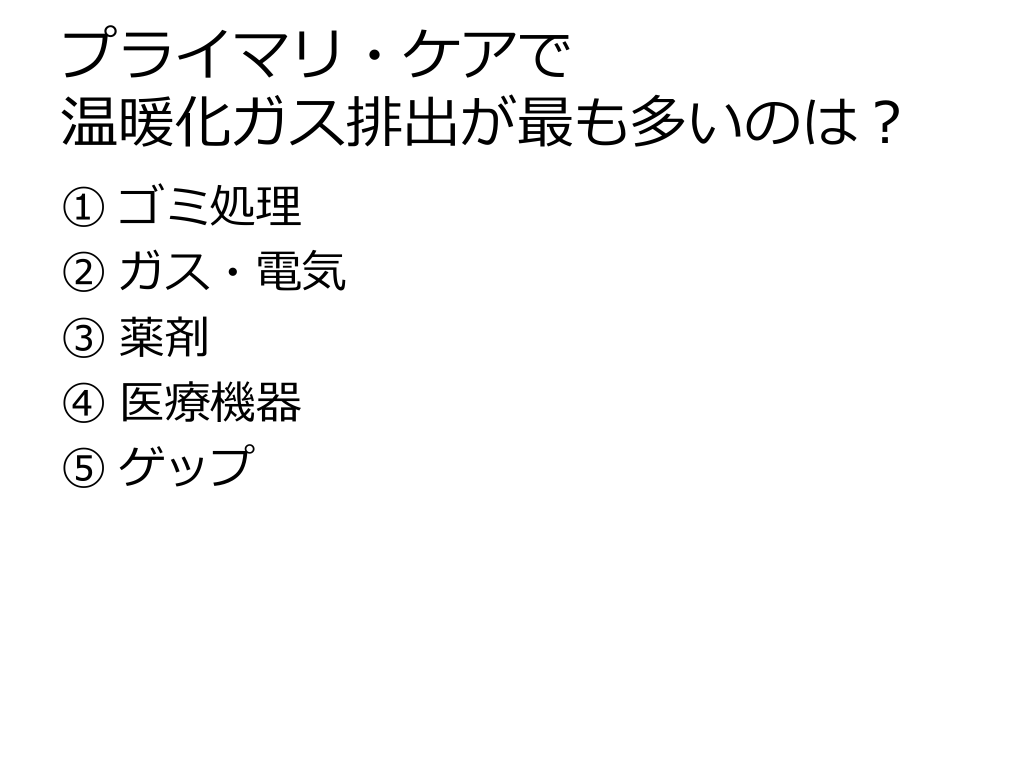 #38. プライマリ・ケアで 温暖化ガス排出が最も多いのは︖ ① ゴミ処理 ② ガス・電気 ③ 薬剤 ④ 医療機器 ⑤ ゲップ