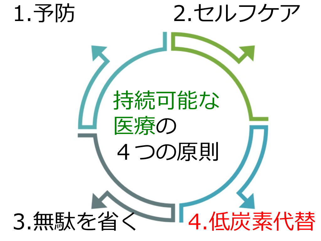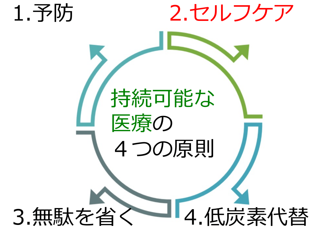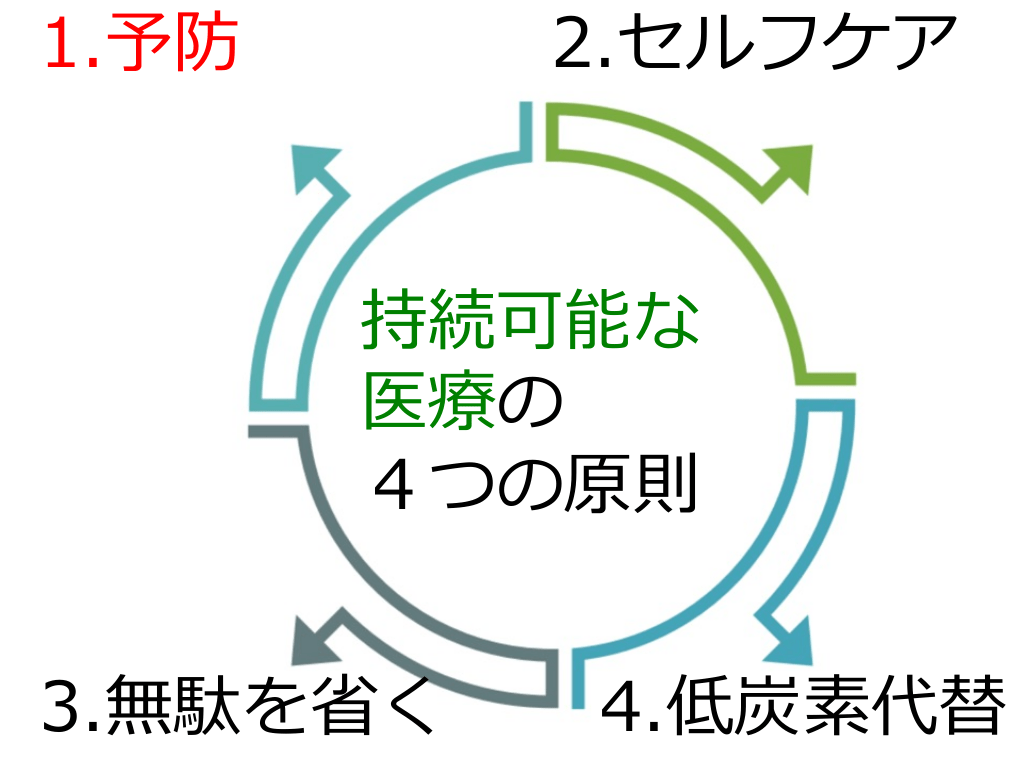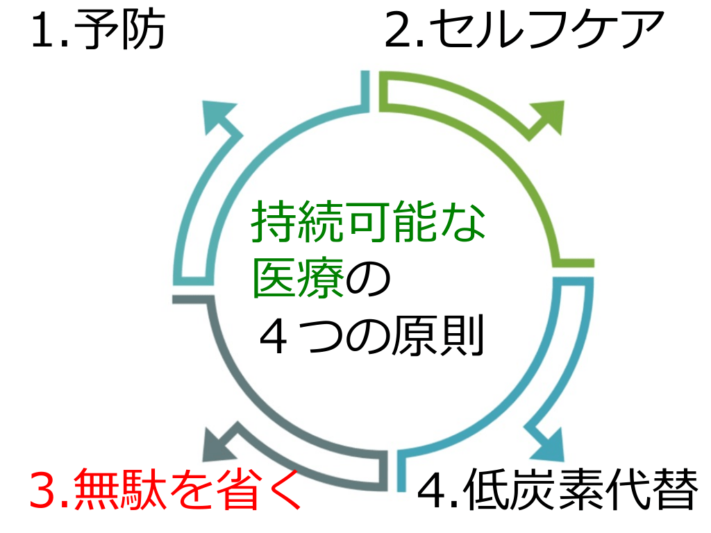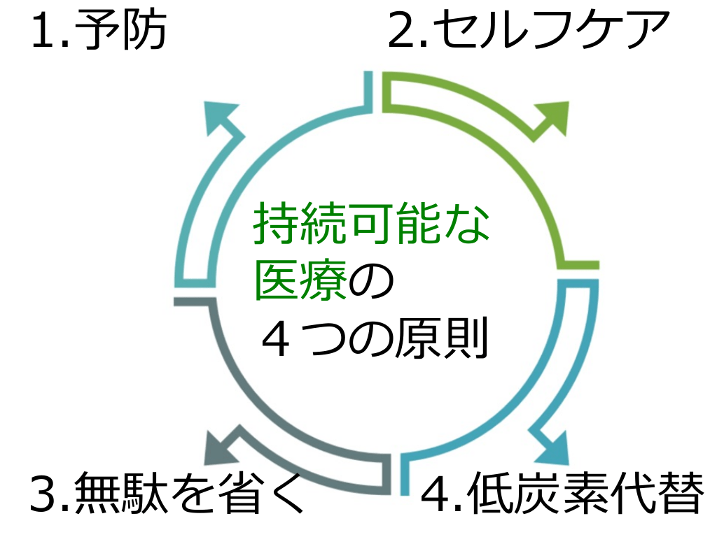 #64. 1.予防 2.セルフケア 持続可能な 医療の 4つの原則 3.無駄を省く 4.低炭素代替