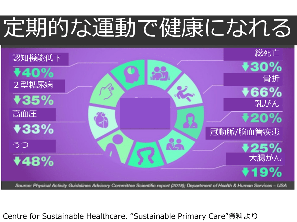 #49. 定期的な運動で健康になれる 認知機能低下 総死亡 ⾻折 2型糖尿病 ⾼⾎圧 乳がん 冠動脈/脳⾎管疾患 うつ ⼤腸がん Centre for Sustainable Healthcare. “Sustainable Primary Care”資料より