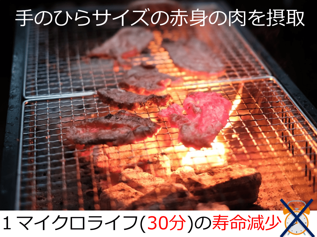 #55. ⼿のひらサイズの⾚⾝の⾁を摂取 1マイクロライフ(30分)の寿命減少