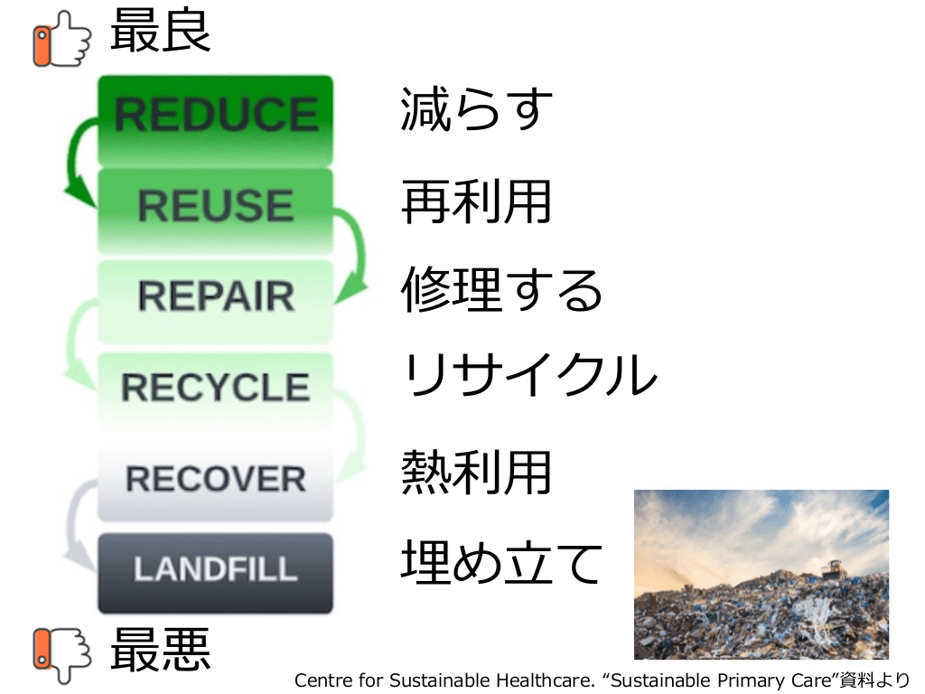 #67. 最良 減らす 再利⽤ 修理する リサイクル 熱利⽤ 埋め⽴て 最悪 Centre for Sustainable Healthcare. “Sustainable Primary Care”資料より