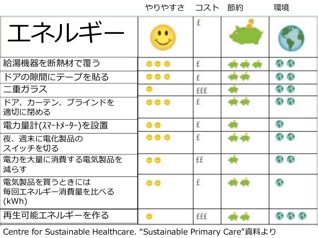 #77. やりやすさ コスト 節約 環境 エネルギー 給湯機器を断熱材で覆う ドアの隙間にテープを貼る ⼆重ガラス ドア、カーテン、ブラインドを 適切に閉める 電⼒量計(スマートメーター)を設置 夜、週末に電化製品の スイッチを切る 電⼒を⼤量に消費する電気製品を 減らす 電気製品を買うときには 毎回エネルギー消費量を⽐べる (kWh) 再⽣可能エネルギーを作る Centre for Sustainable Healthcare. “Sustainable Primary Care”資料より