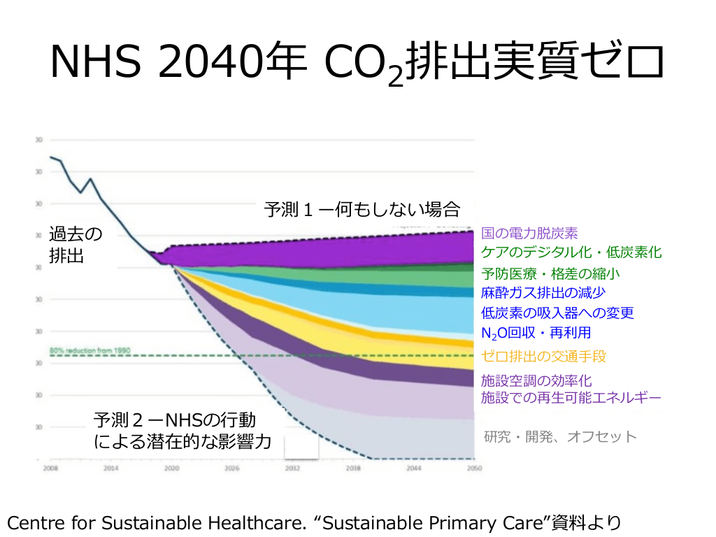 #82. NHS 2040年 CO2排出実質ゼロ 過去の 排出 予測1ー何もしない場合 国の電⼒脱炭素 ケアのデジタル化・低炭素化 予防医療・格差の縮⼩ ⿇酔ガス排出の減少 低炭素の吸⼊器への変更 N2O回収・再利⽤ ゼロ排出の交通⼿段 予測2ーNHSの⾏動 による潜在的な影響⼒ 施設空調の効率化 施設での再⽣可能エネルギー 研究・開発、オフセット Centre for Sustainable Healthcare. “Sustainable Primary Care”資料より