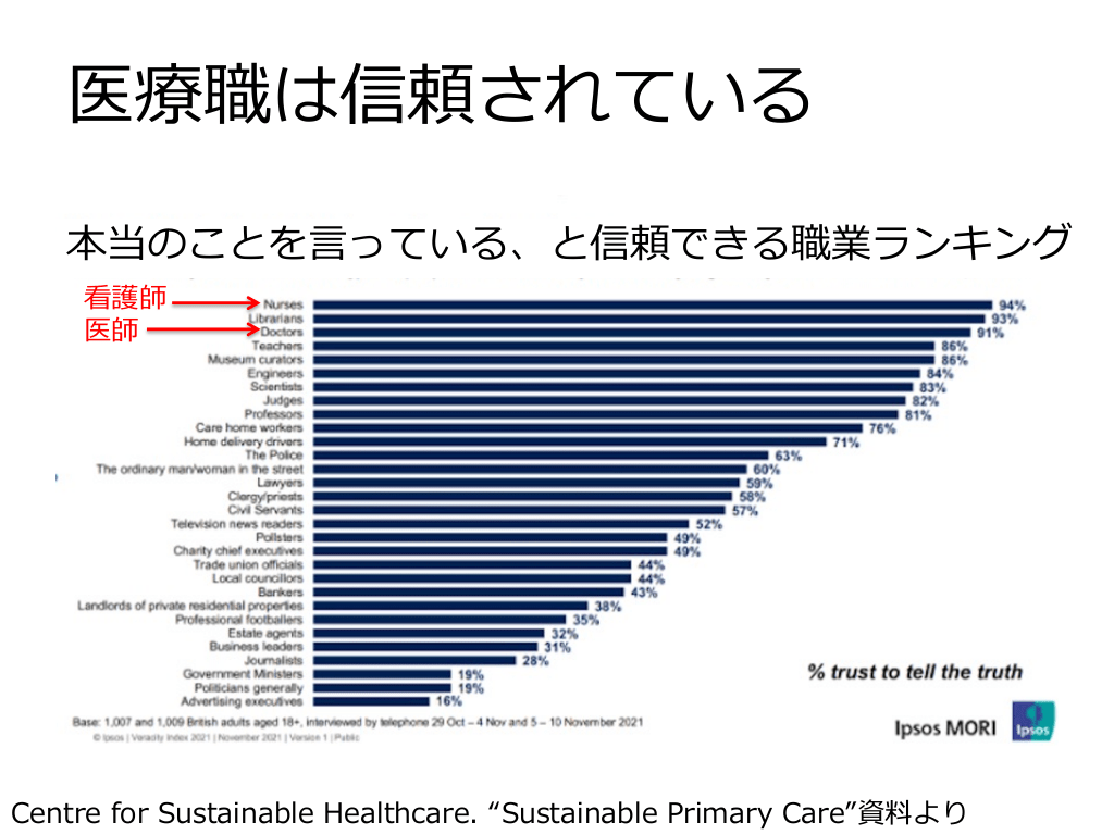 #83. 医療職は信頼されている 本当のことを⾔っている、と信頼できる職業ランキング 看護師 医師 Centre for Sustainable Healthcare. “Sustainable Primary Care”資料より