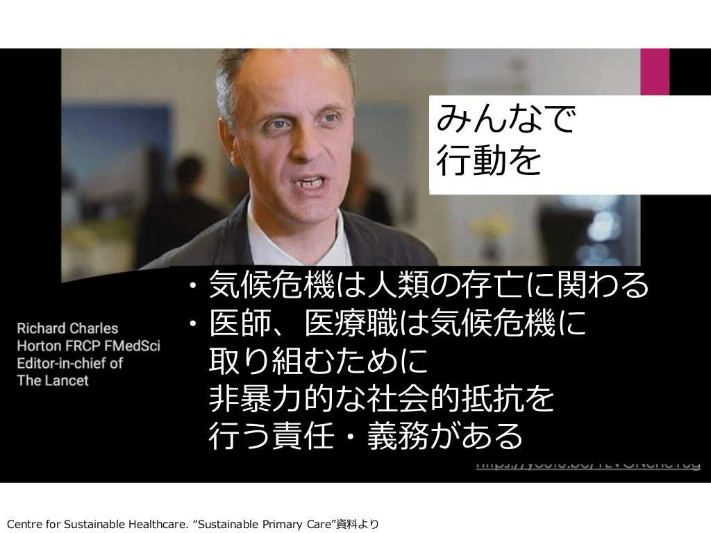 #85. みんなで ⾏動を ・気候危機は⼈類の存亡に関わる ・医師、医療職は気候危機に 取り組むために ⾮暴⼒的な社会的抵抗を ⾏う責任・義務がある Centre for Sustainable Healthcare. “Sustainable Primary Care”資料より