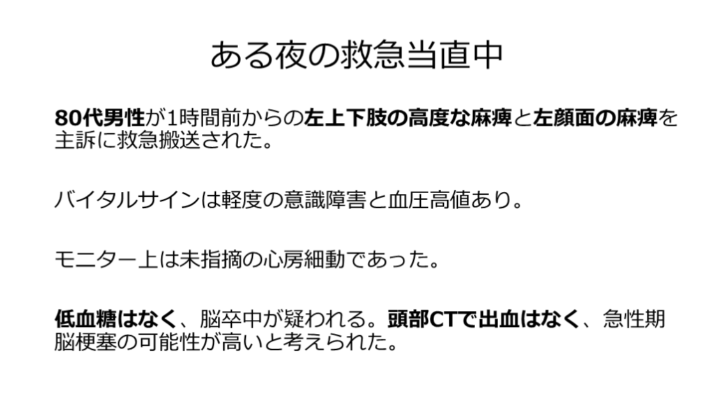 #2. ある夜の救急当直中 80代男性が1時間前からの左上下肢の高度な麻痺と左顔面の麻痺を主訴に救急搬送された。