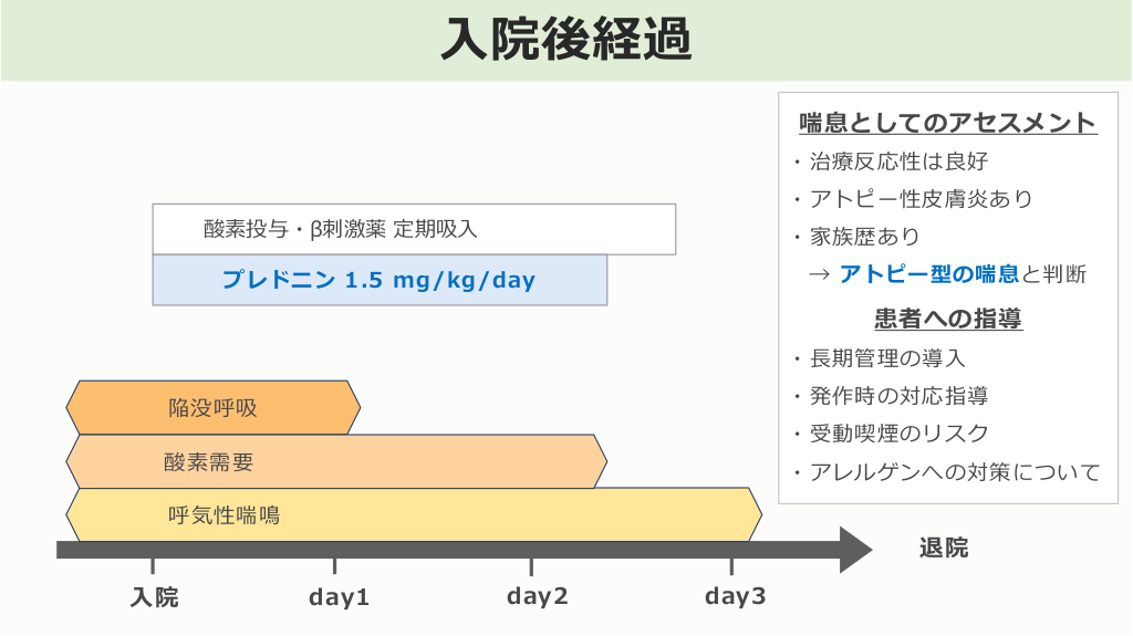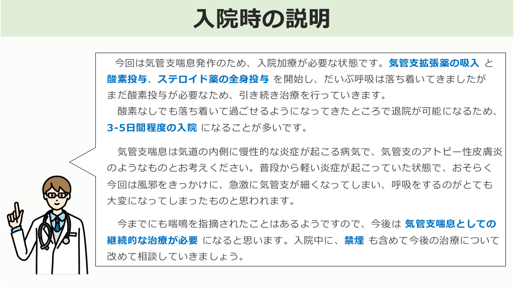 #10. ⼊院時の説明 今回は気管⽀喘息発作のため、⼊院加療が必要な状態です。気管⽀拡張薬の吸⼊ と 酸素投与、ステロイド薬の全⾝投与 を開始し、だいぶ呼吸は落ち着いてきましたが まだ酸素投与が必要なため、引き続き治療を⾏っていきます。 酸素なしでも落ち着いて過ごせるようになってきたところで退院が可能になるため、 3-5⽇間程度の⼊院 になることが多いです。 気管⽀喘息は気道の内側に慢性的な炎症が起こる病気で、気管⽀のアトピー性⽪膚炎 のようなものとお考えください。普段から軽い炎症が起こっていた状態で、おそらく 今回は⾵邪をきっかけに、急激に気管⽀が細くなってしまい、呼吸をするのがとても ⼤変になってしまったものと思われます。 今までにも喘鳴を指摘されたことはあるようですので、今後は 気管⽀喘息としての 継続的な治療が必要 になると思います。⼊院中に、禁煙 も含めて今後の治療について 改めて相談していきましょう。