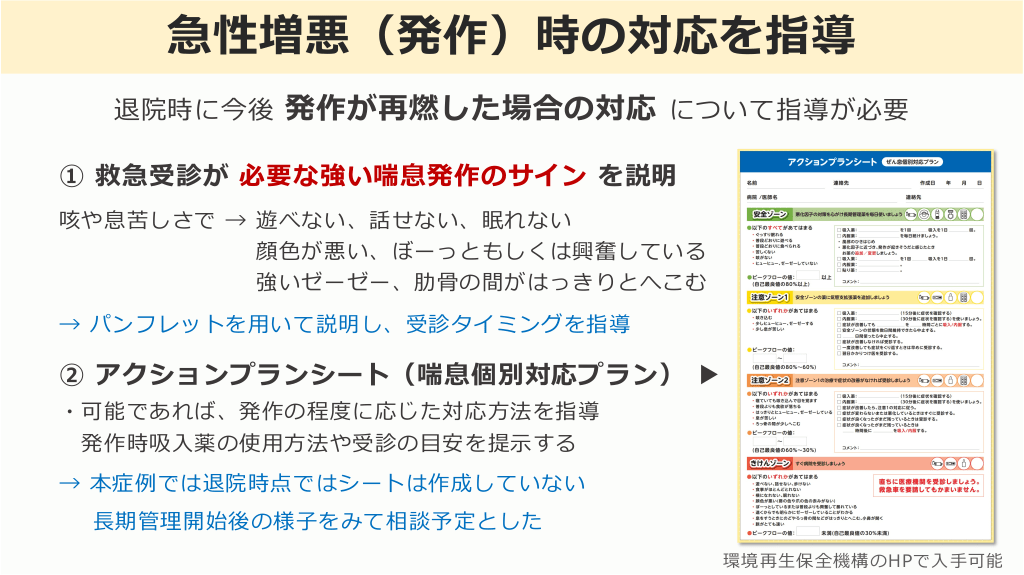 #12. 急性増悪(発作)時の対応を指導 退院時に今後 発作が再燃した場合の対応 について指導が必要 ① 救急受診が 必要な強い喘息発作のサイン を説明 咳や息苦しさで → 遊べない、話せない、眠れない 顔⾊が悪い、ぼーっともしくは興奮している 強いゼーゼー、肋⾻の間がはっきりとへこむ → パンフレットを⽤いて説明し、受診タイミングを指導 ② アクションプランシート(喘息個別対応プラン) ▶ ・可能であれば、発作の程度に応じた対応⽅法を指導 発作時吸⼊薬の使⽤⽅法や受診の⽬安を提⽰する → 本症例では退院時点ではシートは作成していない ⻑期管理開始後の様⼦をみて相談予定とした 環境再⽣保全機構のHPで⼊⼿可能