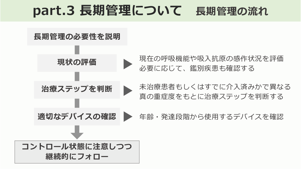 #13. part.3 ⻑期管理について ⻑期管理の流れ ⻑期管理の必要性を説明 現状の評価 治療ステップを判断 適切なデバイスの確認 コントロール状態に注意しつつ 継続的にフォロー 現在の呼吸機能や吸⼊抗原の感作状況を評価 必要に応じて、鑑別疾患も確認する 未治療患者もしくはすでに介⼊済みかで異なる 真の重症度をもとに治療ステップを判断する 年齢・発達段階から使⽤するデバイスを確認