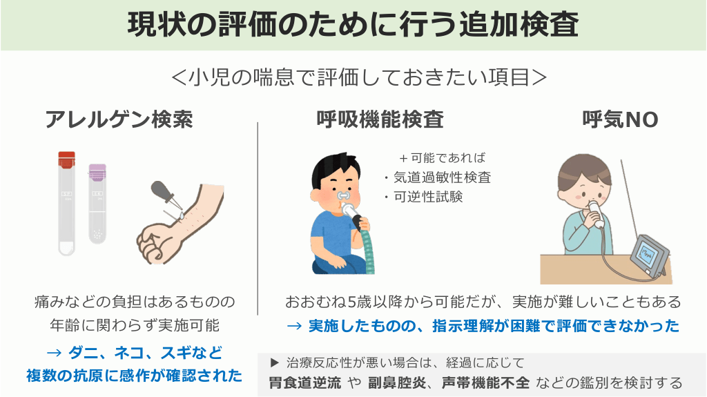 #14. 現状の評価のために⾏う追加検査 <⼩児の喘息で評価しておきたい項⽬> アレルゲン検索 呼吸機能検査 呼気NO +可能であれば ・気道過敏性検査 ・可逆性試験 痛みなどの負担はあるものの おおむね5歳以降から可能だが、実施が難しいこともある 年齢に関わらず実施可能 → 実施したものの、指⽰理解が困難で評価できなかった → ダニ、ネコ、スギなど 複数の抗原に感作が確認された ▶ 治療反応性が悪い場合は、経過に応じて 胃⾷道逆流 や 副⿐腔炎、声帯機能不全 などの鑑別を検討する