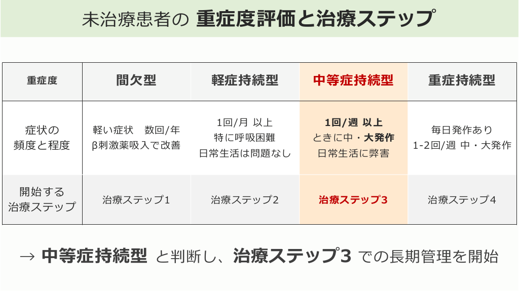 #15. 未治療患者の 重症度評価と治療ステップ 重症度 症状の 頻度と程度 開始する 治療ステップ 間⽋型 軽い症状 数回/年 β刺激薬吸⼊で改善 治療ステップ1 軽症持続型 中等症持続型 1回/⽉ 以上 1回/週 以上 特に呼吸困難 ときに中・⼤発作 ⽇常⽣活は問題なし ⽇常⽣活に弊害 治療ステップ2 治療ステップ3 重症持続型 毎⽇発作あり 1-2回/週 中・⼤発作 治療ステップ4 → 中等症持続型 と判断し、 治療ステップ3 での⻑期管理を開始