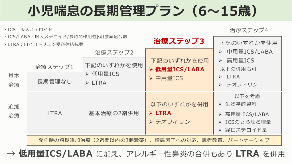 #16. ⼩児喘息の⻑期管理プラン(6〜15歳) ・ICS︓吸⼊ステロイド ・ICS/LABA︓吸⼊ステロイド/⻑時間作⽤性β刺激薬配合剤 ・LTRA︓ロイコトリエン受容体拮抗薬 治療ステップ2 治療ステップ1 基本 治療 ⻑期管理なし 下記のいずれかを使⽤ Ø 低⽤量ICS Ø LTRA 治療ステップ4 治療ステップ3 下記のいずれかを使⽤ Ø 中⽤量ICS/LABA 下記のいずれかを使⽤ Ø 低⽤量ICS/LABA Ø 中⽤量ICS Ø ⾼⽤量ICS 以下の併⽤も可 Ø LTRA Ø テオフィリン 以下を考慮 追加 治療 LTRA 基本治療の2剤併⽤ 以下のいずれかを併⽤ Ø ⽣物学的製剤 Ø LTRA Ø ⾼⽤量 ICS/LABA Ø テオフィリン Ø ICSのさらなる増量 Ø 経⼝ステロイド薬 発作時の短期追加治療(2週間以内のβ刺激薬)、増悪因⼦への対応、患者教育、パートナーシップ → 低⽤量ICS/LABA に加え、アレルギー性⿐炎の合併もあり LTRA を併⽤