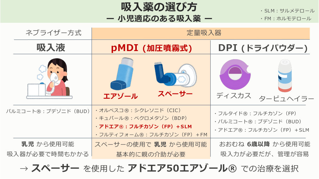 #17. 吸⼊薬の選び⽅ ・SLM︓サルメテロール ー ⼩児適応のある吸⼊薬 ー ネブライザー⽅式 吸⼊液 ・FM︓ホルモテロール 定量吸⼊器 pMDI (加圧噴霧式) エアゾール スペーサー パルミコート®︓ブデゾニド(BUD) ・オルベスコ®︓シクレソニド(CIC) ・キュバール®︓ベクロメタゾン(BDP) ・アドエア®︓フルチカゾン(FP)+SLM ・フルティフォーム®︓フルチカゾン(FP)+FM DPI (ドライパウダー) ディスカス タービュヘイラー ・フルタイド®︓フルチカゾン(FP) ・パルミコート®︓ブデゾニド(BUD) ・アドエア®︓フルチカゾン(FP)+SLM 乳児 から使⽤可能 スペーサーの使⽤で 乳児 から使⽤可能 おおむね 6歳以降 から使⽤可能 吸⼊器が必要で時間もかかる 基本的に親の介助が必要 吸⼊⼒が必要だが、管理が容易 → スペーサー を使⽤した アドエア50エアゾール® での治療を選択