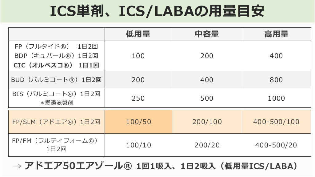#18. ICS単剤、ICS/LABAの⽤量⽬安 低⽤量 中容量 ⾼⽤量 100 200 400 200 400 800 250 500 1000 FP/SLM(アドエア®)1⽇2回 100/50 200/100 400-500/100 FP/FM(フルティフォーム®) 1⽇2回 100/10 200/20 400-500/20 FP(フルタイド®) 1⽇2回 BDP(キュバール®)1⽇2回 CIC(オルベスコ®) 1⽇1回 BUD(パルミコート®)1⽇2回 BIS(パルミコート®)1⽇2回 *懸濁液製剤 → アドエア50エアゾール® 1回1吸⼊、1⽇2吸⼊(低⽤量ICS/LABA)